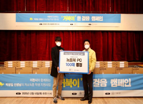 [KNT한국뉴스타임] 경기 이천시는 10일 국어 1타 강사 박광일 강사와 도서출판 홀수는 온라인 수업에 활용할 수 있는 컴퓨터 100대를 기탁했다고 밝혔다.