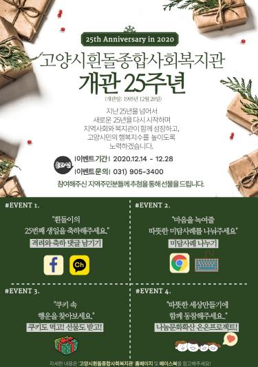 [KNT한국뉴스타임] 고양시는 고양시흰돌종합사회복지관이 개관 25주년을 기념하며 오는 14일(월)부터 28일(월)까지 시민 대상 온라인 이벤트를 진행한다고 밝혔다.