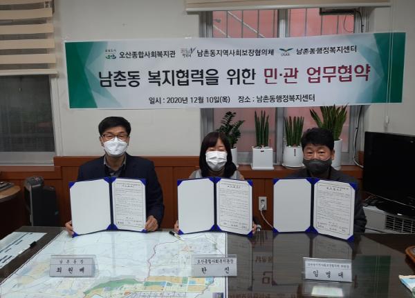 [KNT한국뉴스타임] 오산시 남촌동행정복지센터(동장 최원배)은 지난 10일 오산종합사회복지관(관장 한진), 남촌동지역사회보장협의체(민간위원장 임병대, 이하 동협의체)와 지역복지 발전을 위한 업무협약을 체결했다고 밝혔다.