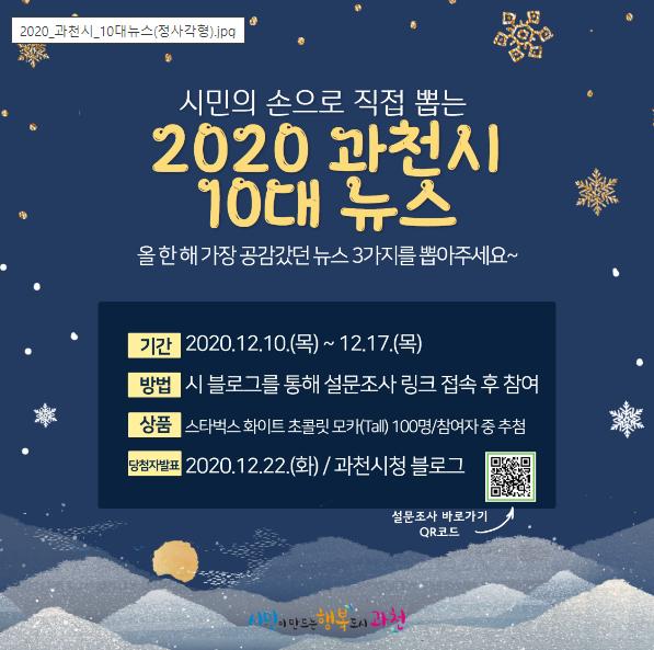 과천시 2020년 10대 뉴스 후보로는 △시민참여형 시정운영 △시민안전보험, 자전거보험 자동 가입 △관악산과 청계산을 연결하는 생태길 조성 △코로나19 방역 활동 △문원사랑방·중앙동회관 개관 △양재천 수질 개선 △과천시민광장을 지키기 위한 노력 △경기도 교통분야 종합평가 최우수상 수상 △스마트 클린버스정류장 설치 등 올 한해 추진된 20개 정책이다.
