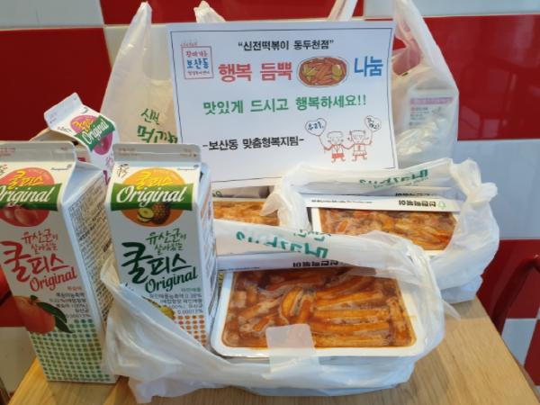 [KNT한국뉴스타임] 동두천시 보산동 행정복지센터는 지난 10일 신전떡볶이 동두천점(대표 최종진)의 후원으로, 보산동 저소득 가정의 아이들에게 떡볶이와 음료수를 전달했다고 밝혔다.