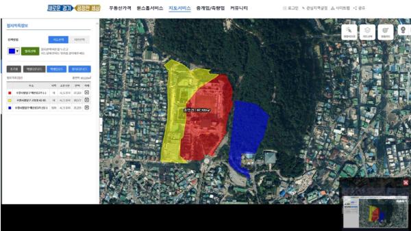 '지도서비스'필지목록조회’에서는 사용자가 지도에 색상으로 표시한 여러 필지를 상세정보화면에서 색상별로 구분할 수 있게 됐으며, ‘원스톱서비스’에서는 ‘지번 검색’ 및 ‘일필지조회’ 시 검색한 필지의 테두리 색상과 두께를 개선해 사용자가 알아보기 쉽도록 개선했다.