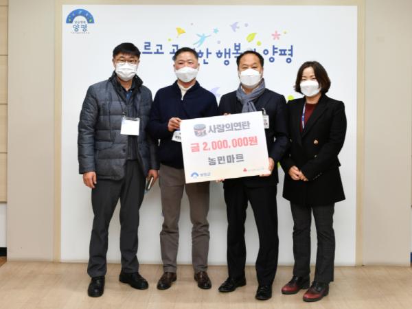 정동균 양평군수는 “어느 때보다도 어려운 시기라서 더 값진 기부라고 생각하며, 농민마트의 관심과 따듯한 손길로 전달되는 성금이 지역사회의 어려운 분들께 잘 사용될 수 있도록 최선을 다하겠다”고 답했다.