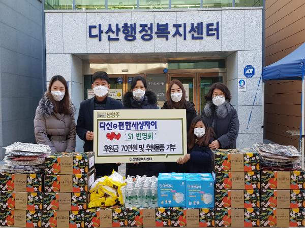 [KNT한국뉴스타임] 남양주시 다산행정복지센터(센터장 김진현)는 다산e편한세상자이아파트‘S1번영회’(회장 조경아)에서 지난 14일 다산1동 취약계층을 위한 후원금 70만원 및 각종 후원물품을 서부희망케어센터에 지정 기탁했다고 밝혔다.