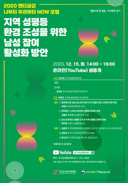 코로나19 방역지침에 따라 유튜브 ‘경기양성평등센터’에서 생중계로 진행되는 이 날 포럼은 지난해부터 경기양성평등센터에서 진행해 온 남성대상 성평등 캠페인 ‘젠더공감 나부터 우리부터 NOW’ 사업 중 하나다.