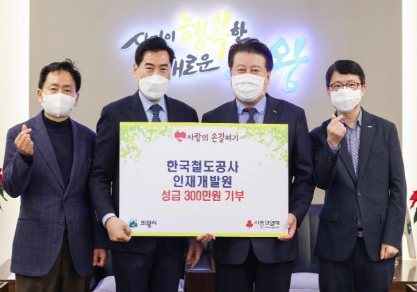 [KNT한국뉴스타임] 한국철도공사 인재개발원(원장 이규영)에서 15일 연말을 맞아 어려운 이웃을 위해 사용해달라며 성금 300만원을 의왕시에 기부했다.