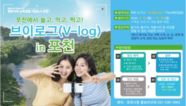 [KNT한국뉴스타임] 포천시는 올해 12월 18일까지 국민 누구나 포천의 먹을거리, 볼거리, 즐길 거리 등 포천을 알리는 브이로그(V-log)를 공유하면 1편당 3만원 활동비를 지원한다.