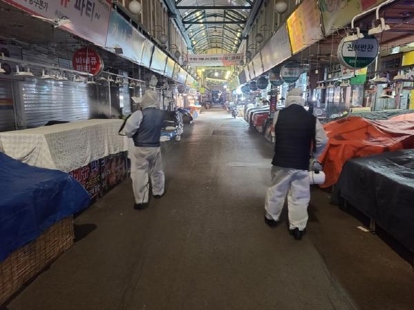 코로나19 확산으로 사회적 거리두기가 2.5단계로 강화됨에 따라 관내 의정부제일시장, 의정부시장, 의정부청과야채시장 등 전통시장 3곳과 환기가 어려워 방역소독이 꼭 필요한 의정부역지하도상가에 대해 전문 소독업체와 함께 출입문, 이동통로, 화장실 등 시장 구석구석을 누비며 소독을 실시했다.