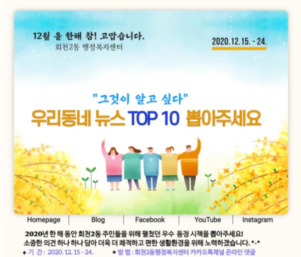 회천2동은 10대 뉴스 순위 선정을 위해 오는 24일까지 회천2동 행정복지센터 카카오톡 공식채널을 통해 온라인 투표를 실시할 예정이다.