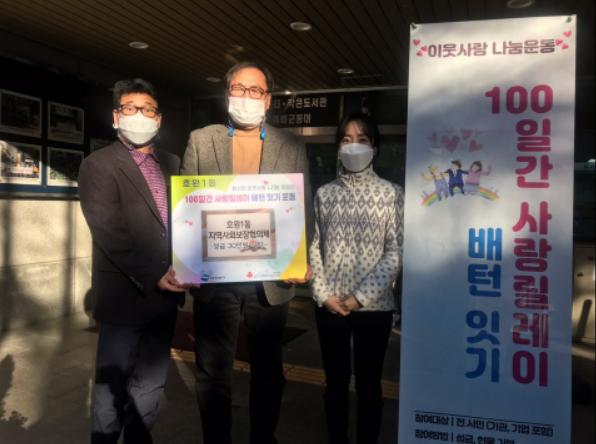 [KNT한국뉴스타임] 의정부시 호원1동 주민센터는 호원1동 지역사회보장협의체가 12월 15일 성금 30만 원을 기탁하며 이웃사랑 나눔 운동인‘100일간 사랑릴레이 배턴 잇기’에 동참했다고 밝혔다.
