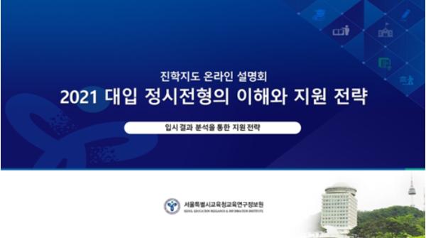 [KNT한국뉴스타임] 서울특별시교육청 산하 교육연구정보원은 12월 17일부터 「2021 대입 정시전형 대비 진학지도 온라인 설명회」동영상을 서울진로진학정보센터 누리집과 서울시교육청 및 교육연구정보원 유튜브 채널을 통하여 제공한다.