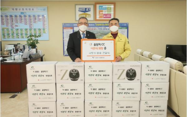 이날 이관식 올림픽CC 회장 및 올림픽CC 관계자가 덕양구청을 직접 방문해 밥솥 30개(750만원 상당)에 대한 전달식을 진행했으며, 이는 어려운 시기를 보내고 있는 한부모가정, 독거노인가정, 조손가정 등 복지 취약계층에 지원될 예정이다.