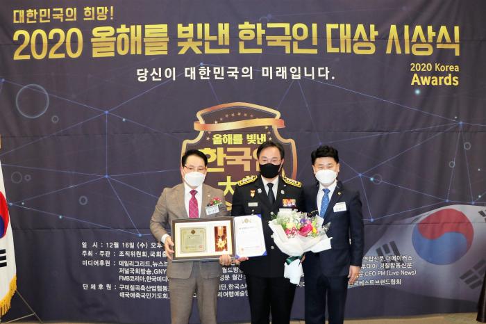 [한국뉴스타이임=명기자] 16일 가평소방서 김전수 서장이 한국프레스센터에서 열린 ‘2020 올해를 빛낸 한국인 대상’ 시상식에서 올해의 소방안전공로부문 수상자로 선정되는 영예를 안게 됐다.