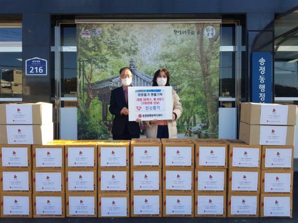 [KNT한국뉴스타임] 진신중기 강미연 대표는 지난 16일 광주시 송정동 행정복지센터를 방문, 어려운 이웃에게 전달해 달라며 라면 30박스와 빵 4박스(100만원 상당)를 전달했다.