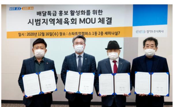 경기도주식회사는 16일 3개 시범지역 체육회와 ‘배달특급 홍보 활성화’를 위한 업무협약을 체결하고 향후 공동으로 ‘배달특급’ 알리기에 적극 나서기로 했다.