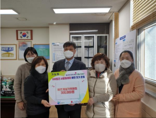 [KNT한국뉴스타임] 의정부시 가능동주민센터는 가능동 바르게살기위원회가 12월 17일 100일간 사랑릴레이 배턴 잇기 운동에 참여하고 싶다며 성금 30만 원을 전달했다고 밝혔다.