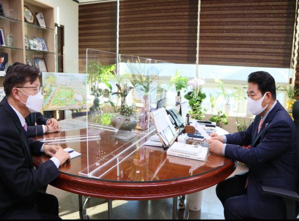 [KNT한국뉴스타임] 백군기 용인시장은 18일 시청 시장실에서 김재만 용인도시공사 도시사업본부장을 만나 취임 축하 인사를 전했다.