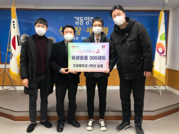 이번에 기부한 위생용품은 코로나19 감염 예방을 위한 손소독제로 구성, 지역사회 내 감염 확산을 방지하고 어려운 소외이웃들에게 따뜻한 온기를 전달하고자 조양중학교 3학년 학생 일동이 뜻을 모아 마련했다.