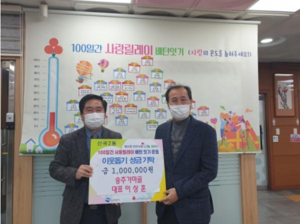 신곡2동 주민센터는 신곡2동에 위치한 송추가마골 의정부지점은 12월 18일 100일간 사랑릴레이 배턴잇기 운동에 동참하여 100만 원 상당의 갈비탕 50개를 기탁했다고 밝혔다.