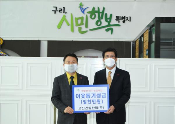 [KNT한국뉴스타임] 구리시는 지난 18일 시청 복지회의실에서 코로나19 확산 방지를 위한 방역수칙을 철저하게 준수하며 최소 인원만 참석한 가운데, 요진건설산업(주)로부터 관내 어려운 이웃을 위한 성금 일천만원을 전달받았다.