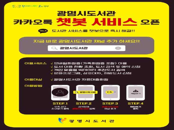 카카오톡이 가능한 스마트폰을 소지한 시민 누구나 이용할 수 있으며 카카오톡 친구목록 화면의 검색창(돋보기 모양)에 ‘광명시도서관’을 검색, 채널 추가 후 채팅하기에서 최초 한 번만 로그인하면 ▲모바일 회원증(가족 회원 포함) ▲도서 이용 현황 조회 ▲도서 검색 및 예약(연장) ▲문화행사 조회 및 신청을 할 수 있다.