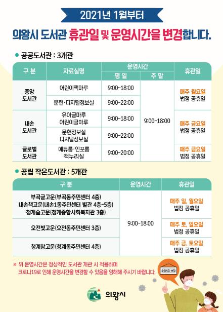 [KNT한국뉴스타임] 의왕시는 다가오는 2021년 1월부터 공공도서관 자료실 휴관일을 중앙도서관은 매주 월요일, 내손도서관과 글로벌도서관은 매주 금요일로 변경한다고 밝혔다.