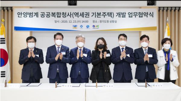 이재명 경기도지사와 최대호 안양시장, 이헌욱 경기주택도시공사(GH) 사장, 배찬주 안양도시공사 사장은 23일 도청에서 안양범계 공공복합청사(역세권 기본주택) 개발을 위한 업무협약을 체결했다. 협약식에는 이재정 국회의원, 경기도의회 조광희 의원, 안양시의회 최병일 부의장도 참석했다.