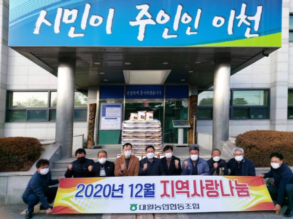 [KNT한국뉴스타임] 이천시는 대월농협에서 연말연시를 맞아 지역 소외계층 가구들이 건강하고 따뜻한 겨울을 보낼 수 있도록 대월농협 임직원들이 십시일반 모은 성금으로 지역사랑 나눔의 쌀 4kg 235포를 기탁했다고 밝혔다.