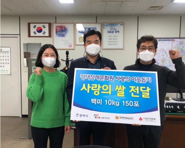 ㈜평택장례문화원은 2011년부터 매년 연말에 백미를 기탁해왔으며, 올해는 코로나19 여파로 어려움에 처해있음에도 더 어려운 이웃들을 위해 사용해 달라며 백미를 기탁했다.