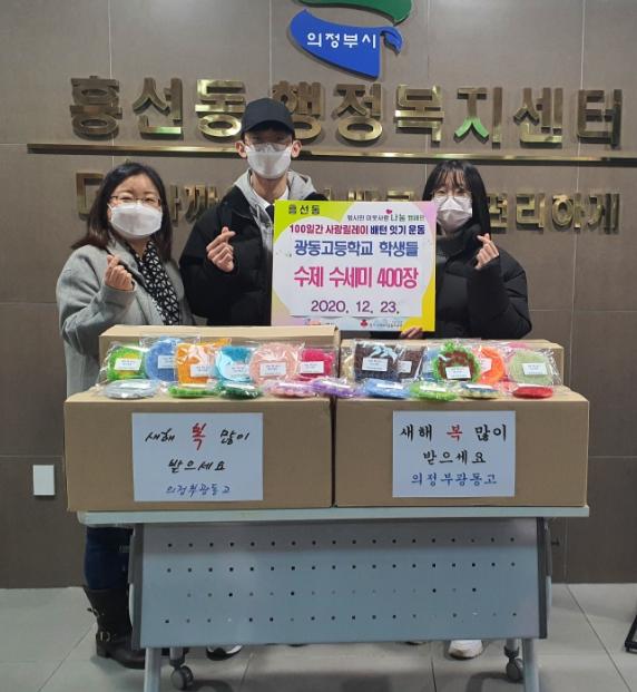 [KNT한국뉴스타임] 흥선동 행정복지센터는 12월 23일 광동고등학교 학생 2명과 학부모 1명이 학생들이 만든 수제 수제미 400개를 기탁했다고 밝혔다.