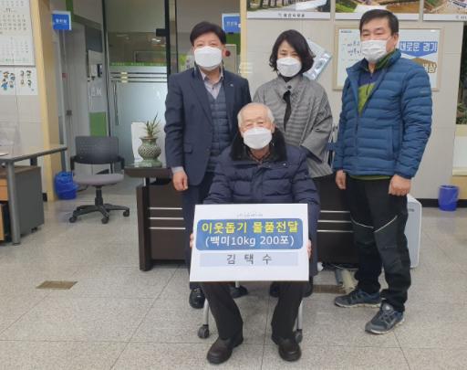 첫 번째 기부자는 개인 후원자인 김택수씨로 지난 12월 중순 저소득 가구의 양곡 지원을 위해 쌀 10kg 200포(620만원 상당)를 옥천면사무소로 기탁했다. 김택수씨는 옥천면이 고향으로 현재 서울에서 동물병원을 운영하고 있으며 코로나19가 심각해지는 상황에 고향 마을을 돕고자 후원하게 되었다.