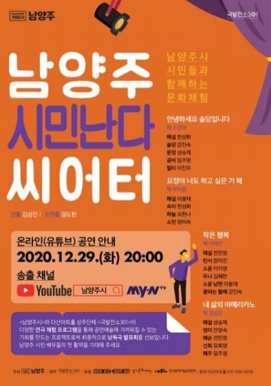 12월 29일(화) 오후 8시 다산아트홀에서 공연 예정이었던 남양주시 시민들과 함께 하는 문화 체험 ‘남양주 시민난다 씨어터’는 정부의 사회적 거리두기 2.5단계 격상 조치에 따라 코로나19 확산 방지를 위해 남양주시 공식 유튜브 채널 ‘MY-Ntv’에서 무관중 유튜브 중계로 운영한다.