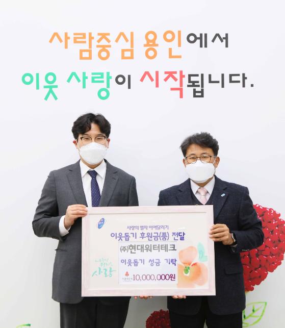 용인시 관내 환경계측장비 제조업체인 ㈜현대워터테크(대표 장우진)는 29일 용인시청을 방문해 어려운 이웃을 위해 써 달라며 성금 1000만원을 기탁했다.
