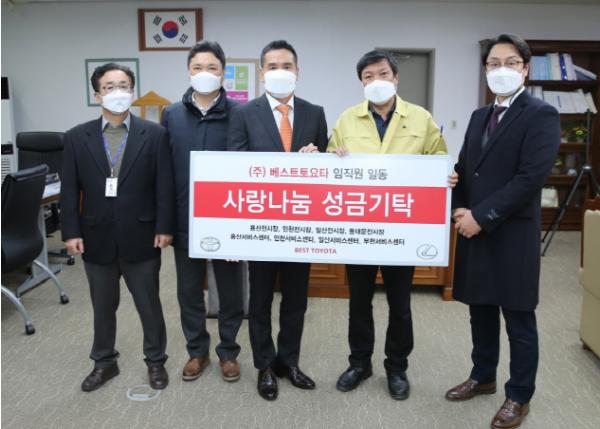 이 기부금은 ㈜베스트토요타 일산전시장 임직원 32명이 연말 월급에서 한푼 두푼 정성어린 자발적 성금을 모아 기부한 것으로 그 의미가 더욱 특별하다.