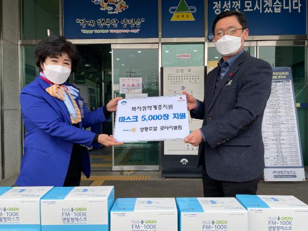 [KNT한국뉴스타임] 양평로얄 로타리클럽(회장 배귀호, 초대회장 김정옥)에서는 지난 29일 양평읍사무소에 복지취약계층의 코로나 예방을 위한 마스크 5,000장을 기부했다.