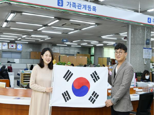 구리시(시장 안승남)는 타 시에서 관내로 이사 오는 전입 신고자와 혼인 신고자들에게 나라사랑 태극기를 증정한다.