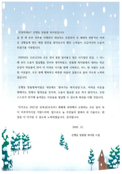 [KNT한국뉴스타임] 시흥시 은행동 행정복지센터 맞춤형복지팀(동장 강동식)은 지난 한 해 코로나19 등 복합적인 위기상황을 극복하기 위해 함께한 2020년 사례관리대상자에게 사례관리 종결을 알림과 동시에 이들의 안부를 확인하기 위한 편지를 발송했다.
