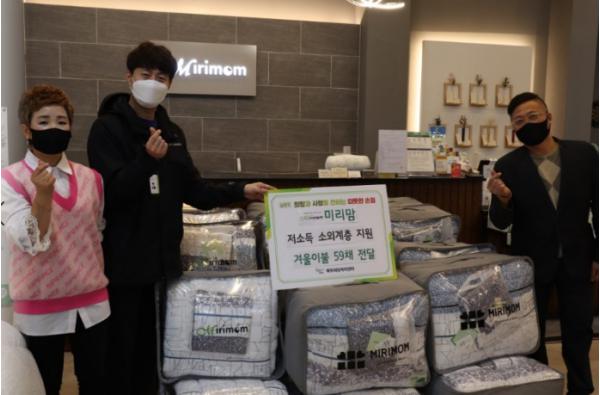 [KNT한국뉴스타임] 남양주시 진접읍 소재 미리맘(대표 염선자)은 지난 29일 지역사회 저소득 이웃의 겨울나기를 위해 1,900만원 상당의 패딩차렵이불 59세트를 북부희망케어센터(센터장 대행 김희정)에 전달하였다.