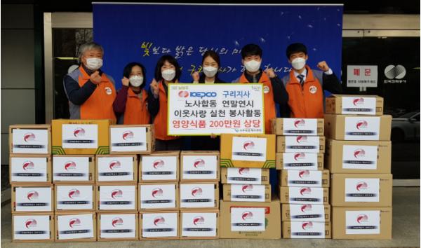 [KNT한국뉴스타임] 한국전력공사 구리지사는 지난 29일 노사합동 연말연시 이웃사랑 실천 봉사활동으로 200만원 상당의 영양식을 남양주시 서부희망케어센터(센터장 신영미)에 전달했다.