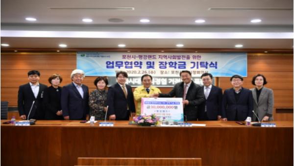또한, 업무협약 체결 이후 권현규 평강랜드 대표는 포천시교육재단에 포천시 인재육성을 위한 장학금(금3,000만원)을 기탁했다.