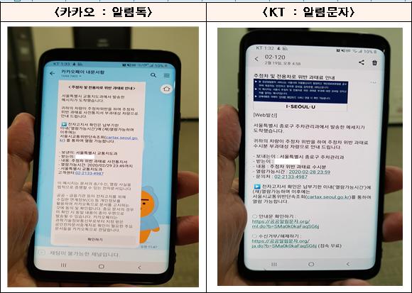 서울시는 교통위반과태료 고지서(사전통지서, 수시분고지서)에 대한 '모바일 전자고지서비스'를 시작한다고 밝혔다. 본인명의 스마트폰 가입 납세자인 경우 별도 신청이나 앱 설치 필요 없이 문자(MMS)나 카카오톡 알림톡으로 받을 수 있다.