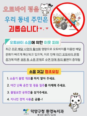 [KNT한국뉴스타임] 고양시 덕양구는 지난 12월 31일 오토바이 굉음으로 고통을 겪고 있는 주민들의 불편사항을 해소하기 위해 오토바이 소음 예방 홍보활동을 펼쳤다.