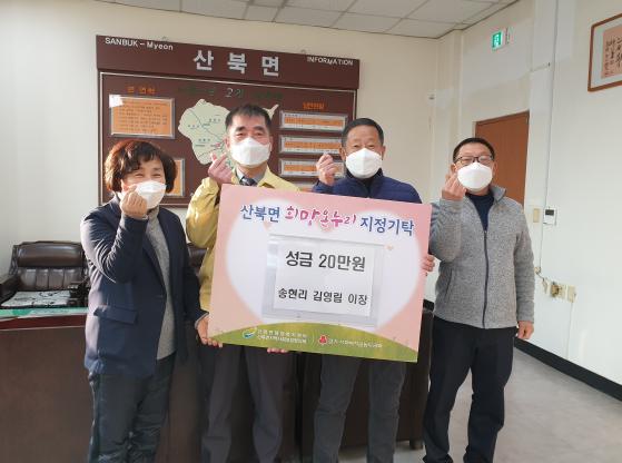 박세윤 산북면장은 “관내 취약가구를 위해 나눔을 해주셔서 감사하다.” 라며, “기탁해주신 성금은 산북면 관내 취약가구 복지증진과 코로나19 극복을 위해 사용하겠다.”라고 말했다.