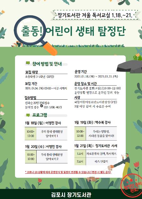 [KNT한국뉴스타임] 김포시 장기도서관(관장 소영만)에서는 2021년 겨울 독서교실 『출동! 어린이 생태 탐정단』을 1월 18일부터 1월 21일까지 4일간 운영한다.