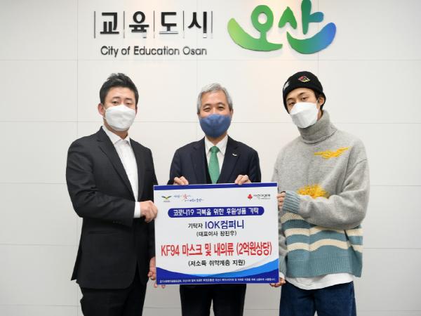 IOK컴퍼니(대표이사 장진우)는 지난 5일 관내 취약계층의 코로나19 극복 및 따뜻한 겨울나기를 돕고자 2억원 상당의 마스크 및 내의류를 기탁하였다.