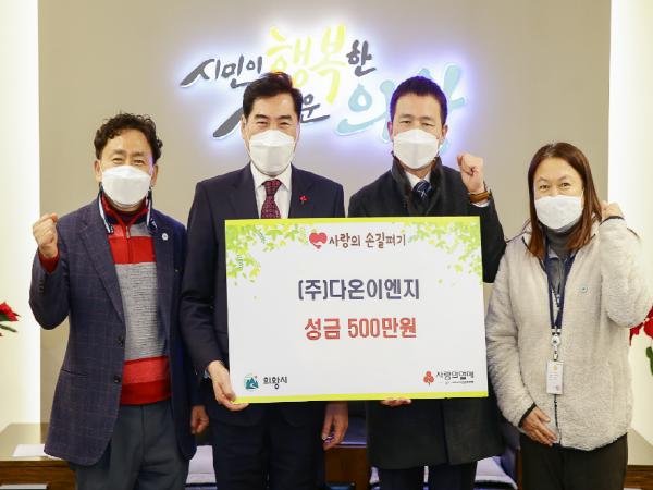 [KNT한국뉴스타임] 의왕시 고천동에 소재한 전기공사 전문업체인 (주)다온ENG(대표 이성일)에서 5일 주변의 어려운 이웃을 위해 사용해달라며 현금 500만원을 의왕시에 전달했다.