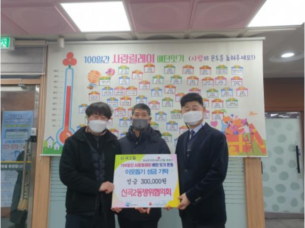 [KNT한국뉴스타임] 의정부시 신곡2동 방위협의회는 1월 5일 신곡2동 주민센터를 방문하여 100일간 사랑릴레이 배턴잇기 운동에 성금 30만 원을 기탁했다.