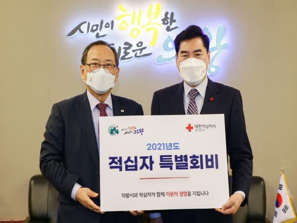 [KNT한국뉴스타임] 의왕시는 6일 시청 시민소통실에서 2021년 적십자 특별회비를 대한적십자사 경기도지사에 전달했다.