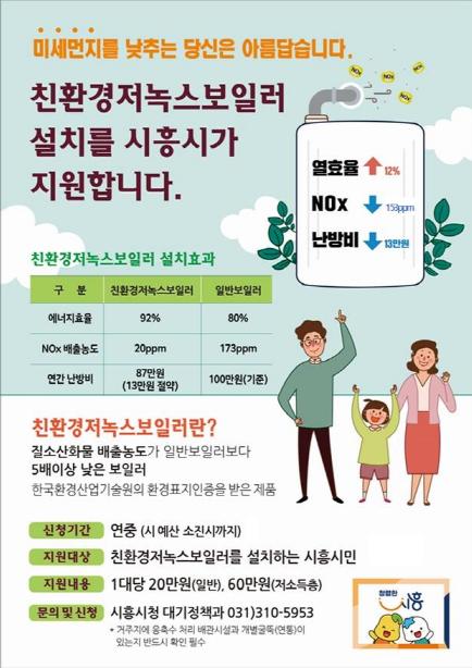 시흥시 관계자는 “올해 총 3,000대를 지원할 계획으로, 신청자가 많아 예산이 빨리 소진될 수 있으니 보일러 교체 계획이 있다면 시간적 여유가 있을 때 미리 교체를 하는 것이 좋다”고 말했다.