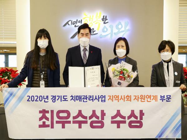 [KNT한국뉴스타임] 의왕시는 의왕시치매안심센터가 지난 12월 경기도에서 비대면으로 개최한‘2020년 경기도 치매관리사업 발전대회’에서 지역사회 자원연계 부문 최우수기관상을 수상했다고 밝혔다.
